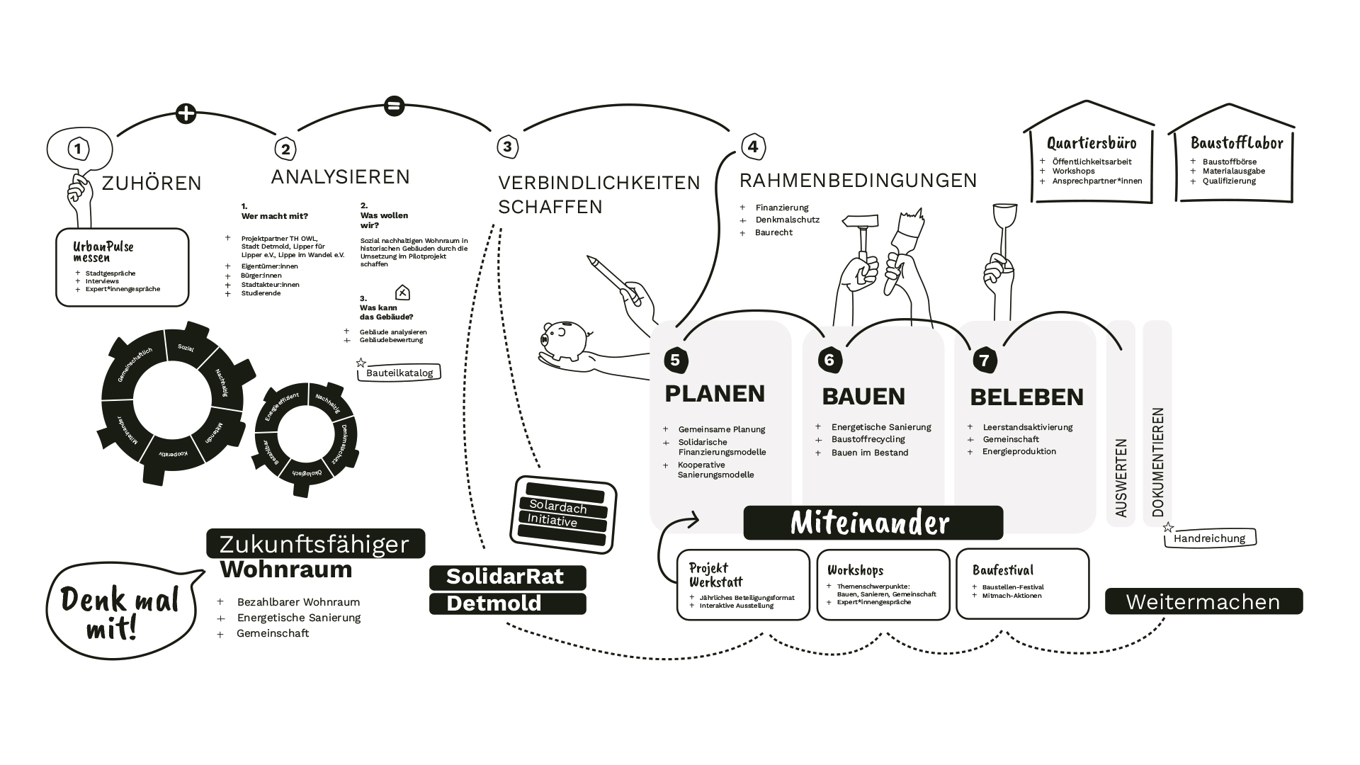 Zur Verstetigung des Projektes wird mit einem SolidarRat eine dauerhafte Struktur für Mitbestimmung und Kooperation angelegt. Öffentliche Veranstaltungen und Aktionen vor Ort machen Prozesse sichtbar und fördern Beteiligung.